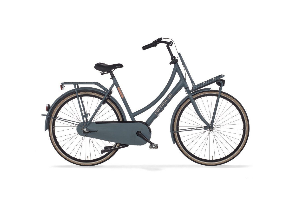 Cortina Transport U4 damesfiets in framemaat 57cm. Kleur: Smooth Grey Matte. Uitgerust met achter een Shimano Nexus 3-traps versnellingsnaaf met terugtraprem en voor een standaard naaf. Opvallende details: aluminium frame, stuurslot, voordrager. Kleurnummer: UGSW 90040 Matte.